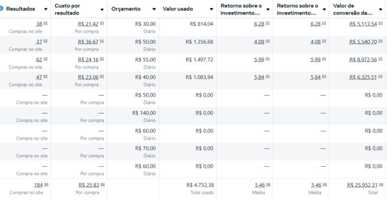 Foram geradas 184 vendas com investimento de 25,83 por cada e retorno de 5,46.