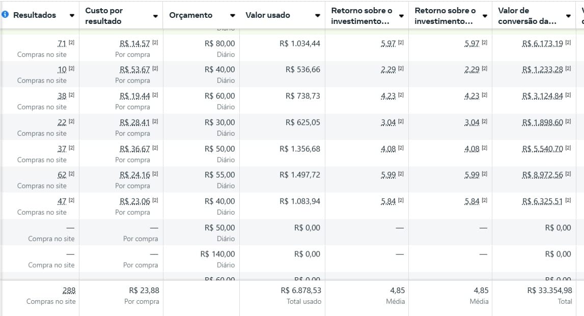 Foram geradas 288 vendas com investimento de 23,88 por cada e retorno de 4,85.