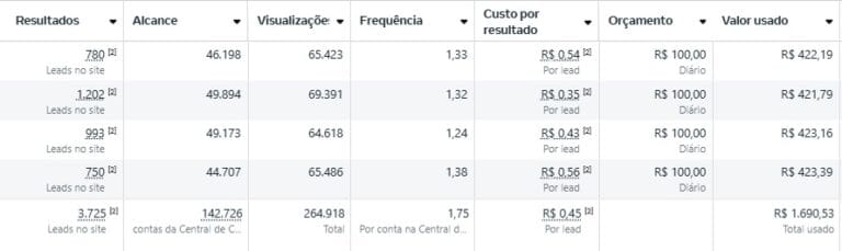 Foram alcançados 3.725 leads ao custo de R$0,45 por cada.